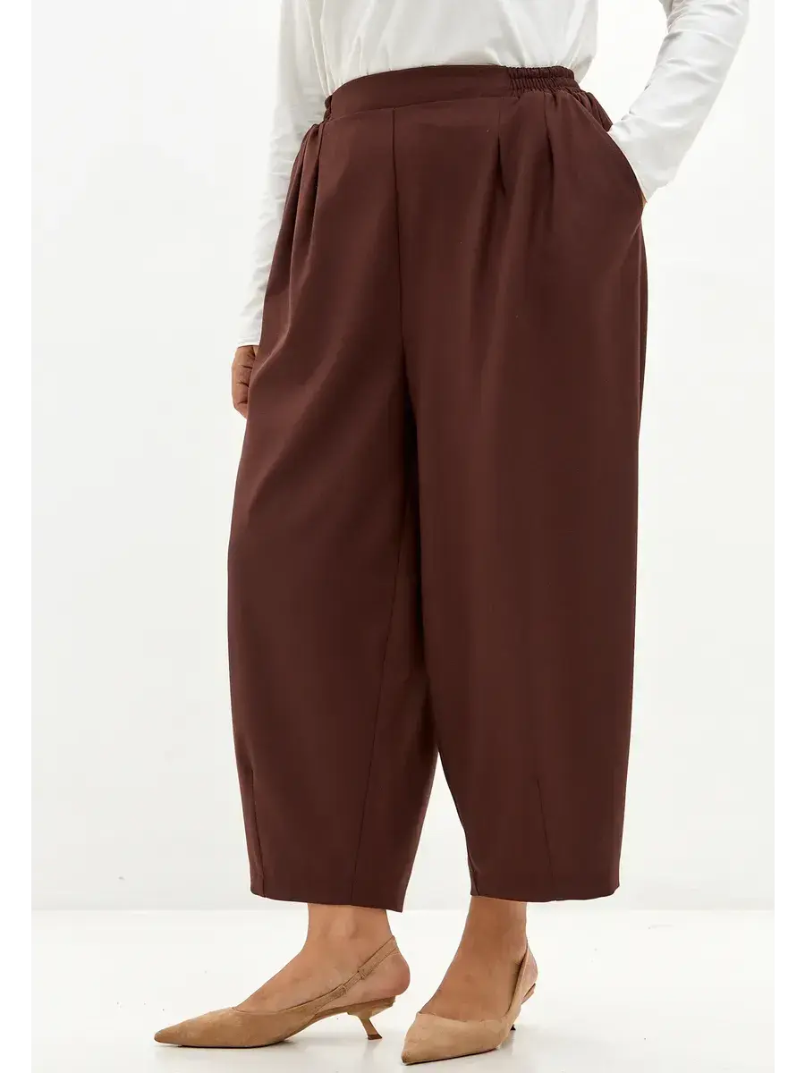 Свободный оверсайз-крой с характерным объёмом в области бедер и мягким сужением к низу обеспечивает комфорт и стильный силуэт. Передние вытачки создают дополнительный объем и подчёркивают уникальную форму «бананов», а эластичная вставка на поясе сзади адаптируется под фигуру, сохраняя свободу движений.