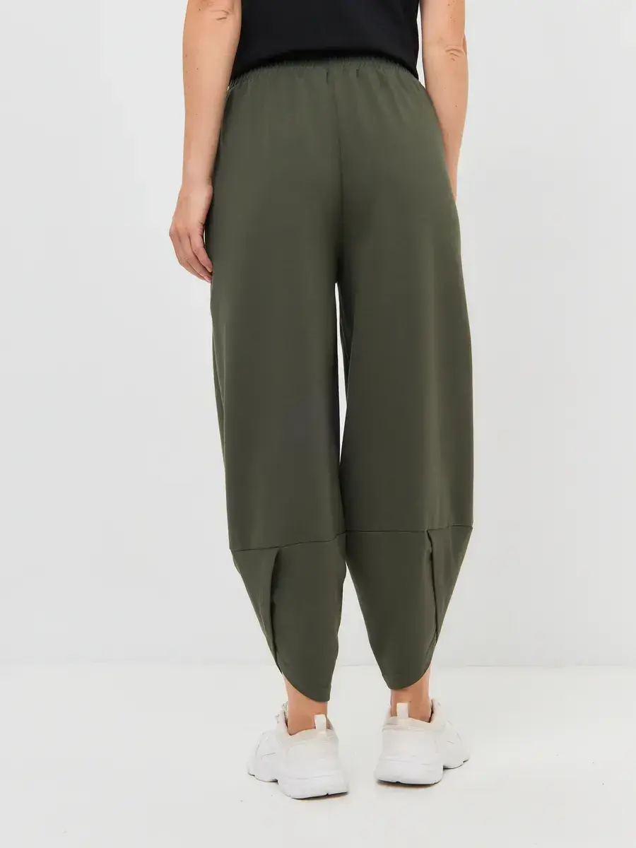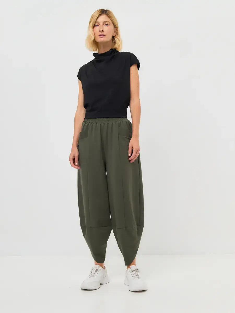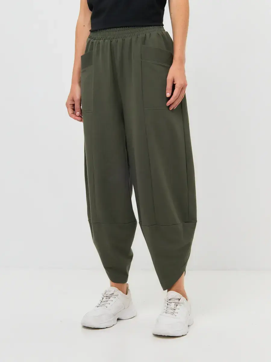 Особое внимание привлекает конструкция штанин: широкий объём в бедрах постепенно сужается книзу, а оригинальная линия низа с перекрестом придаёт образу характер и динамику. Глубокие накладные карманы не только функциональны, но и становятся стильным акцентом.