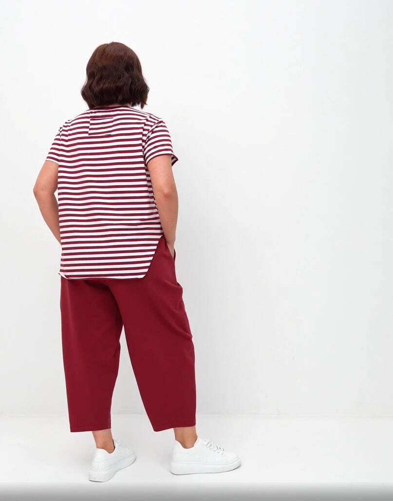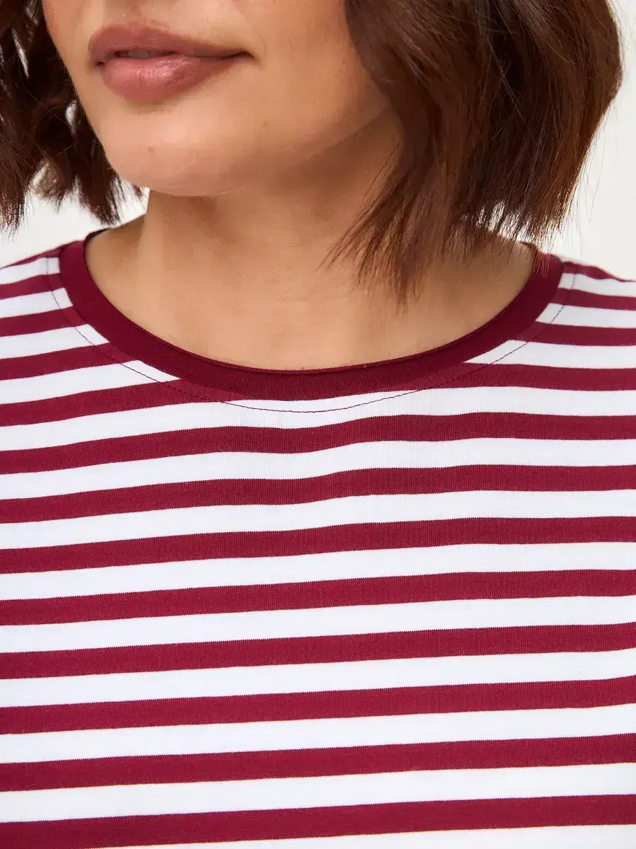 Футболка дизайнерская тельняшка оверсайз с фигурным низом тельняшка/винный