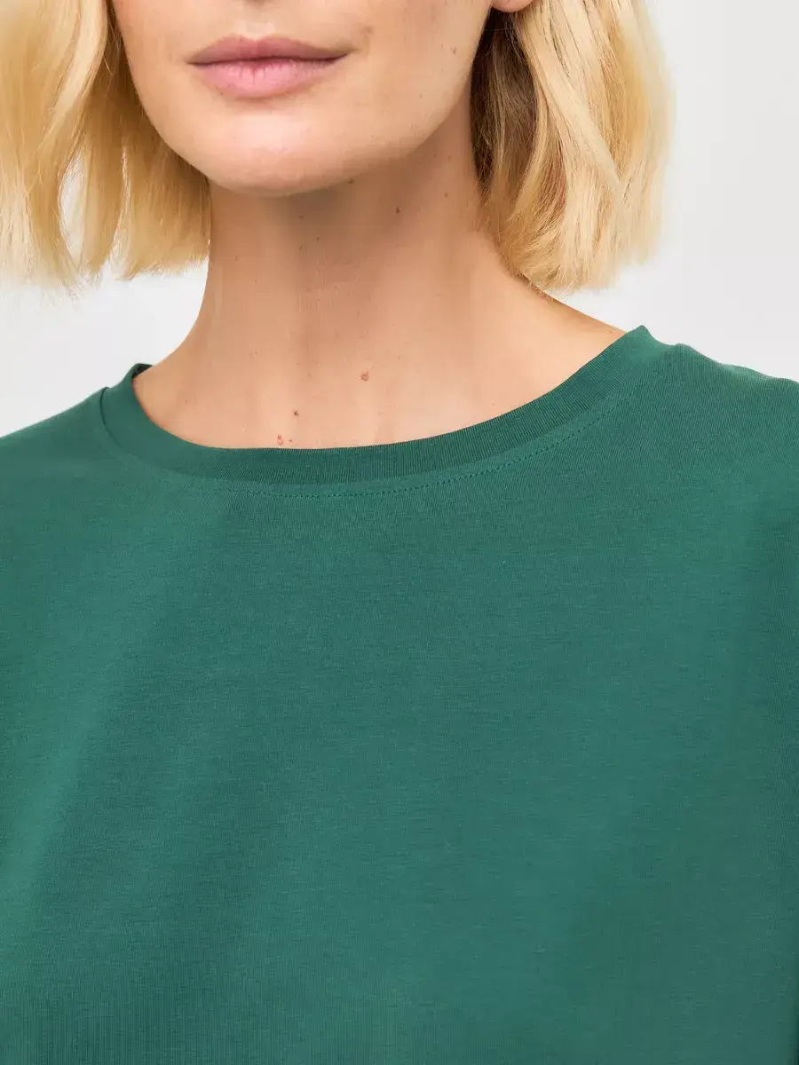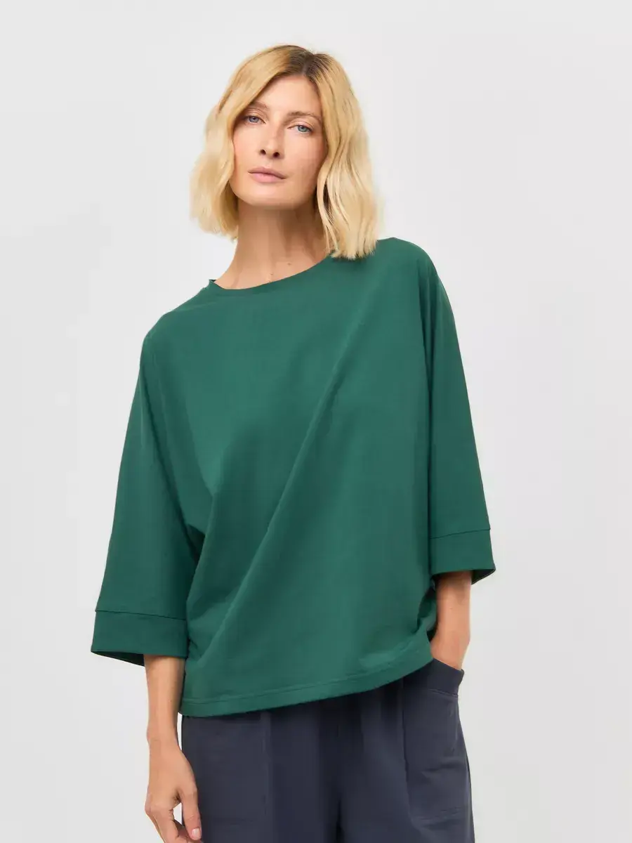 Футболка из премиальной кулирной глади (95% хлопок, 5% эластан) с эффектным кроем «летучая мышь» — идеальное сочетание комфорта и стиля. Свободный оверсайз-силуэт обеспечивает максимальную свободу движений, а мягкая эластичная ткань нежно ложится по фигуре, сохраняя форму и не теряя вида после стирок. Спущенная линия плеча и объемные рукава ¾ придают образу расслабленную элегантность. Прямой низ и слегка укороченная длина позволяют носить футболку как навыпуск, так и заправленной. Отлично сочетается с брюками, джинсами и юбками, создавая современный городской образ.