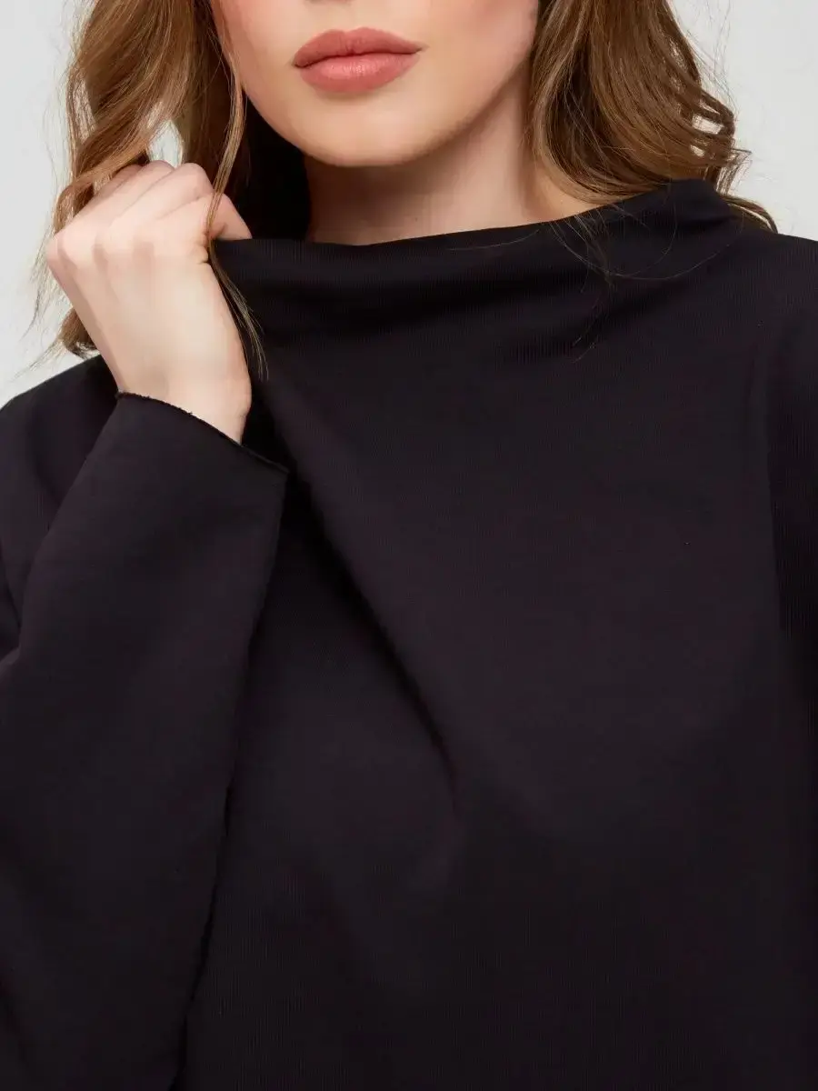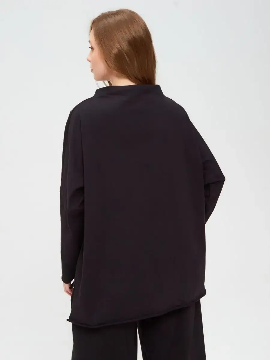 Свободный крой и спущенная линия плеч создают расслабленный силуэт, а удлиненная спинка деликатно прикрывает бедра. Необработанные края низа, рукавов и горловины придают модели легкую небрежность и трендовое настроение. Ворот — мягкий, с широким отворотом-хомутом, который ложится естественными складками и подчеркивает непринужденный стиль.